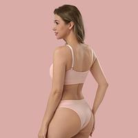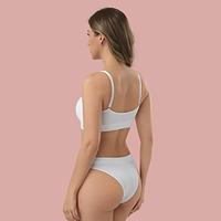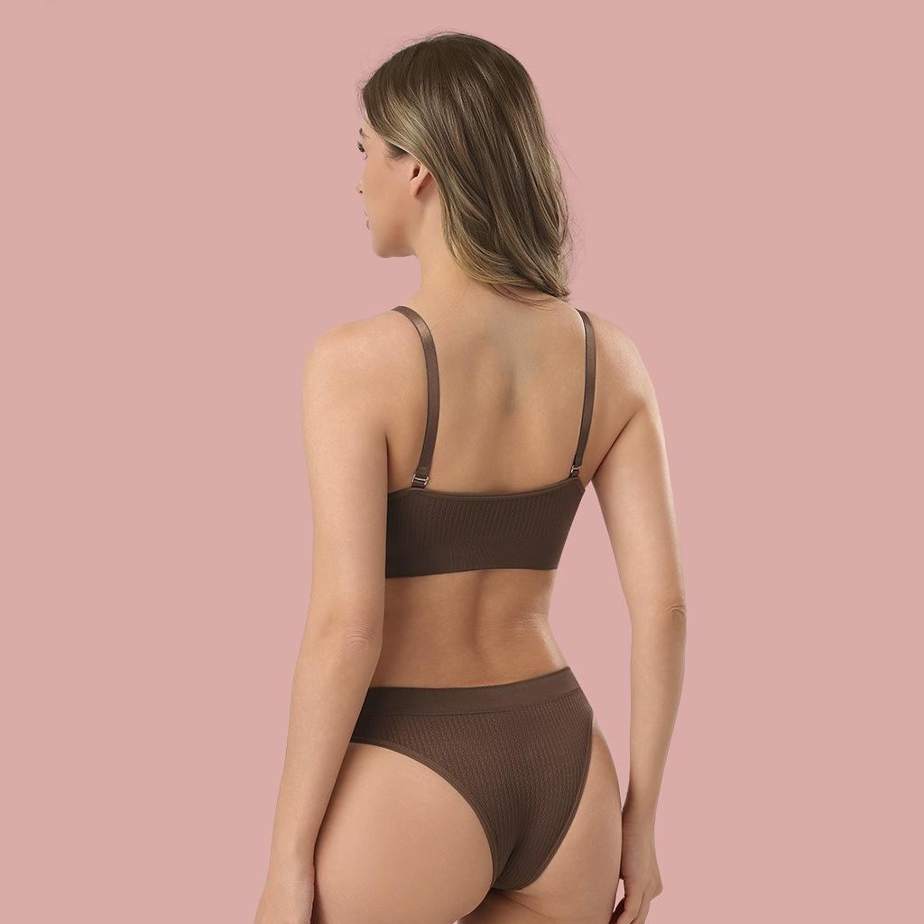 A calcinha tanga tradicional acompanha o mesmo tecido texturizado, com cós confortável e acabamento delicado,